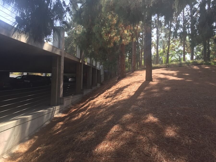 If you look closely, you'll see a bunch of dead pine-needles in front stacked in front of the end of the gulley. I used that as camouflage since at the end of the gulley to the left (off the screen) is the sidewalk leading down to the intersection between Covel, Drake Stadium, and to campus. I hid my duffel bag and trash bag full of blankets there and kept my backpack on me.